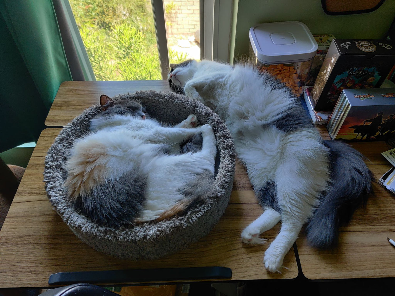 Roll(in the bed) and Rock (on his back) pictured resting by the window